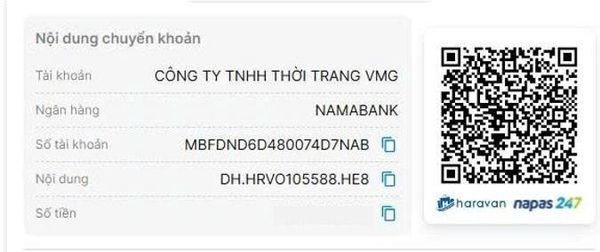 Quý khách vui lòng chuyển khoản vào tài khoản Công ty TNHH Thời Trang VMG để đảm bảo các quyền lợi của Khách hàng.